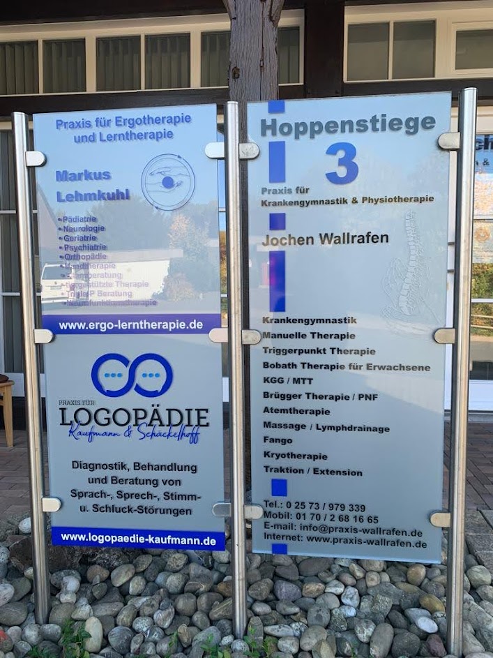 Unter einem Dach befinden sich drei eigenständige Therapeutischen Praxen, bestehend aus der Physiotherapeutischen Praxis Wallrafen, der Ergotherapeutischen / Lerntherapeutischen Praxis Lehmkuhl und der Logopädischen Praxis Kaufmann & Schänkelhoff: